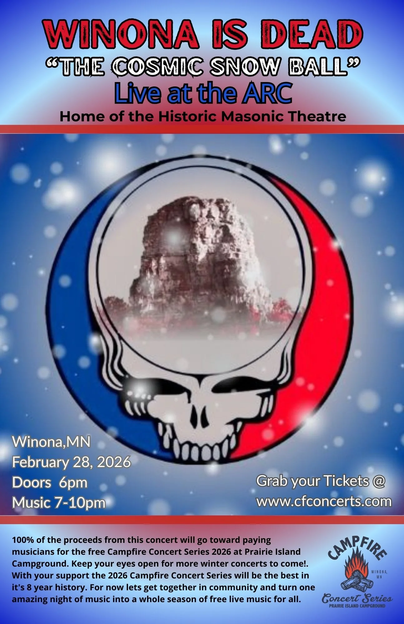The Campfire Concert Series and Winona Is Dead cordially invite you to join us for "The Cosmic Snow Ball" which will feature an evening of Grateful Dead music at The ARC: Home of the Historic Masonic Theatre. 100% of the proceeds raised from this concert will go toward paying musicians for the free Campfire Concert Series 2026 at Prairie Island Campground. With your support, the 2026 Campfire Concert Series will be the best in its 8-year history. For now, let's bring this community together and turn this amazing night of music into a whole season of free live music for all. Get ready to do your part and shake out those winter blues with Winona Is Dead.